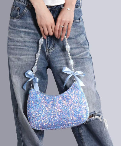 Boutique Sea Blue Sequins Bow Fuzzy Fur Fluffy Shoulder Bags