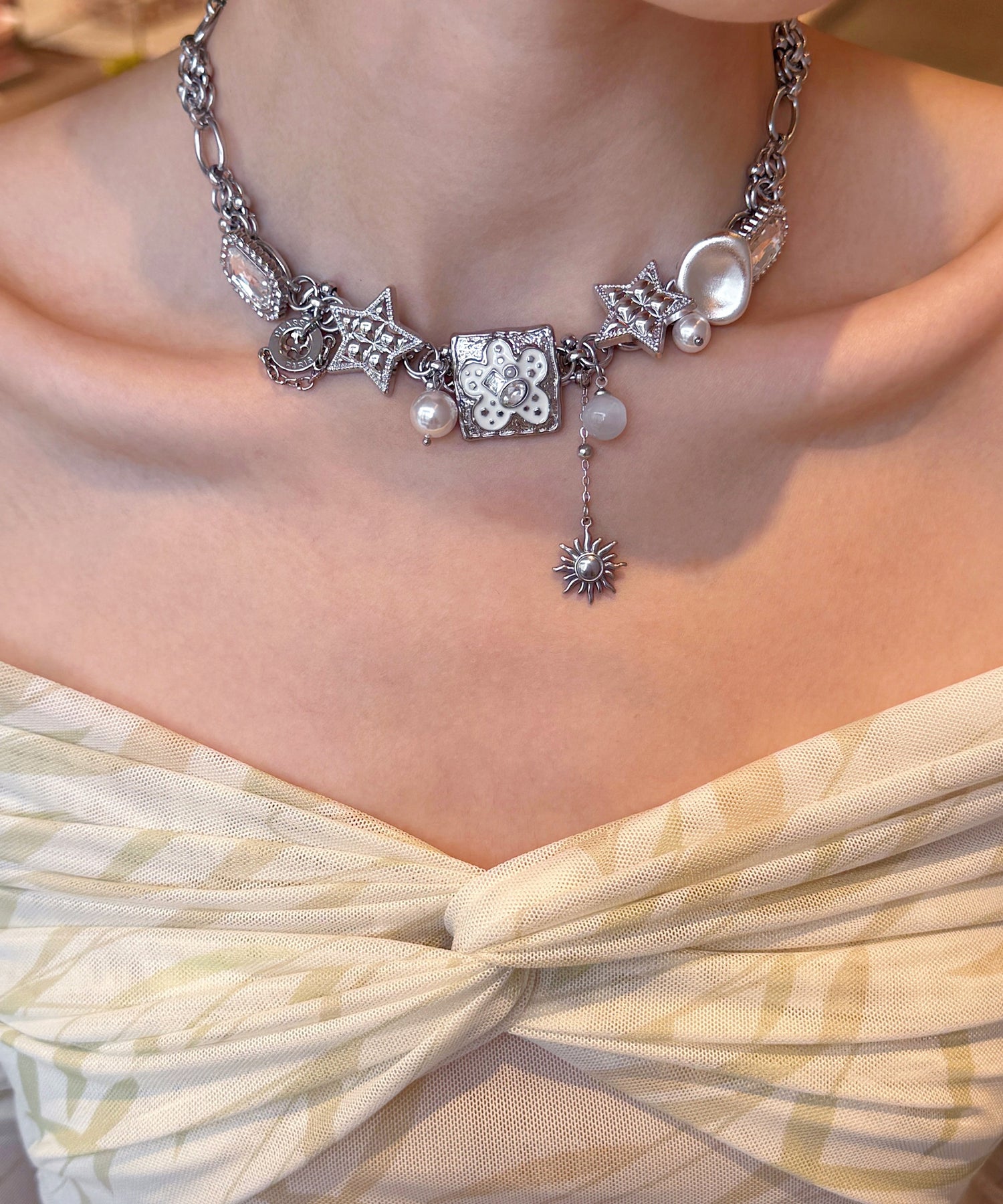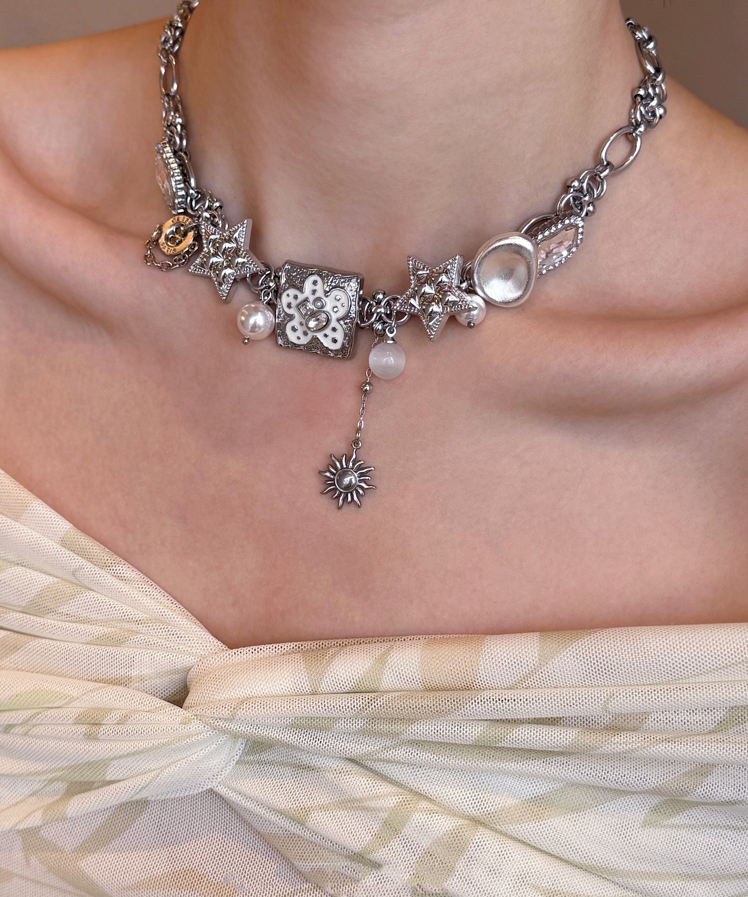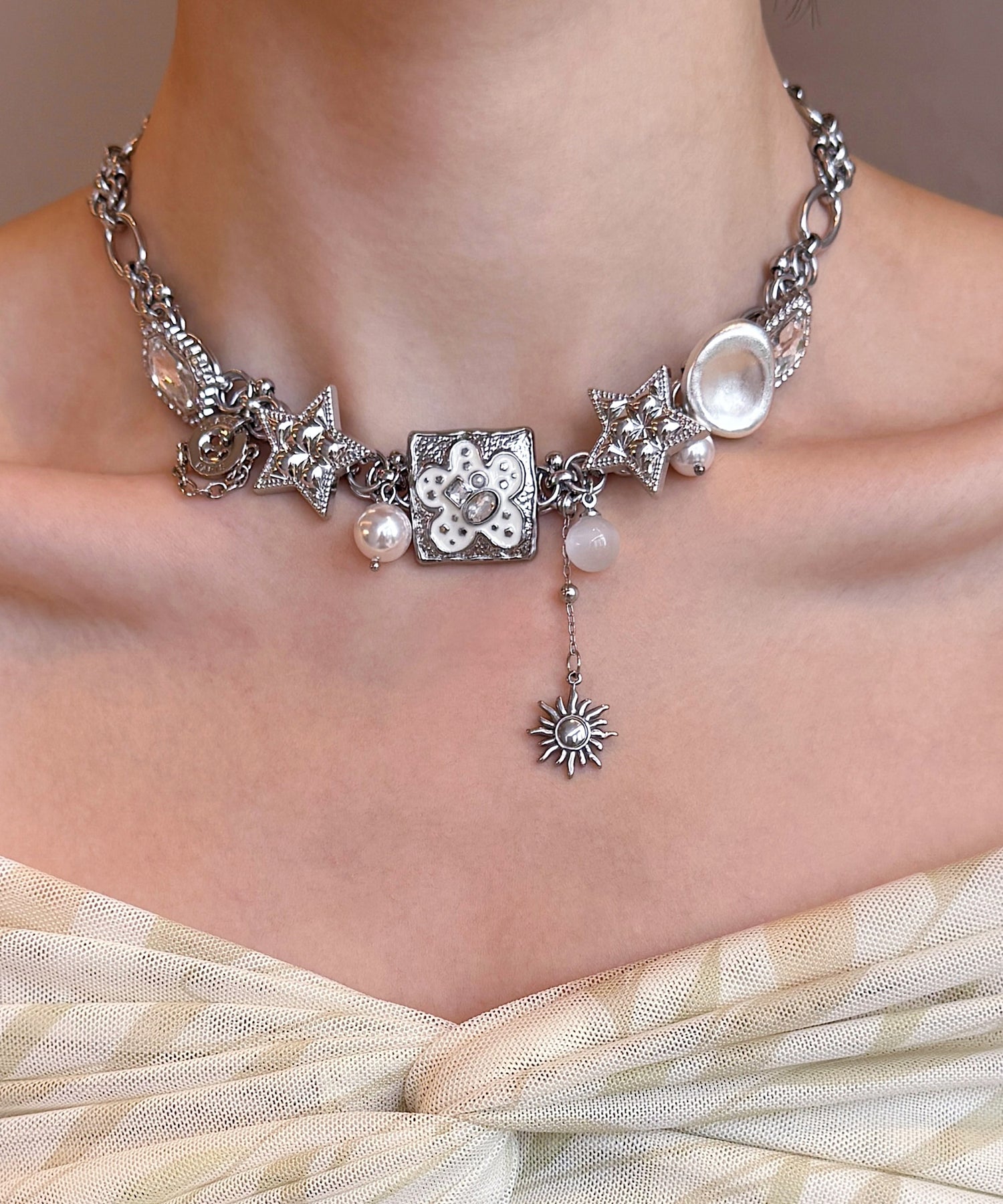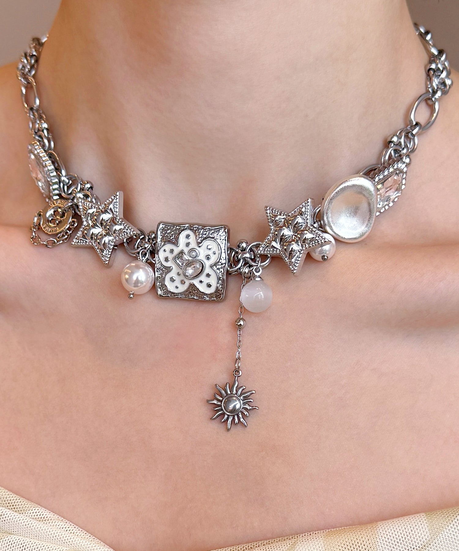 Boutique Silk Stainless Steel Floral Star Pearl Cat's Eye Pendant Necklace