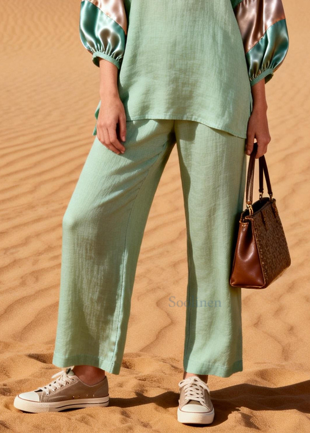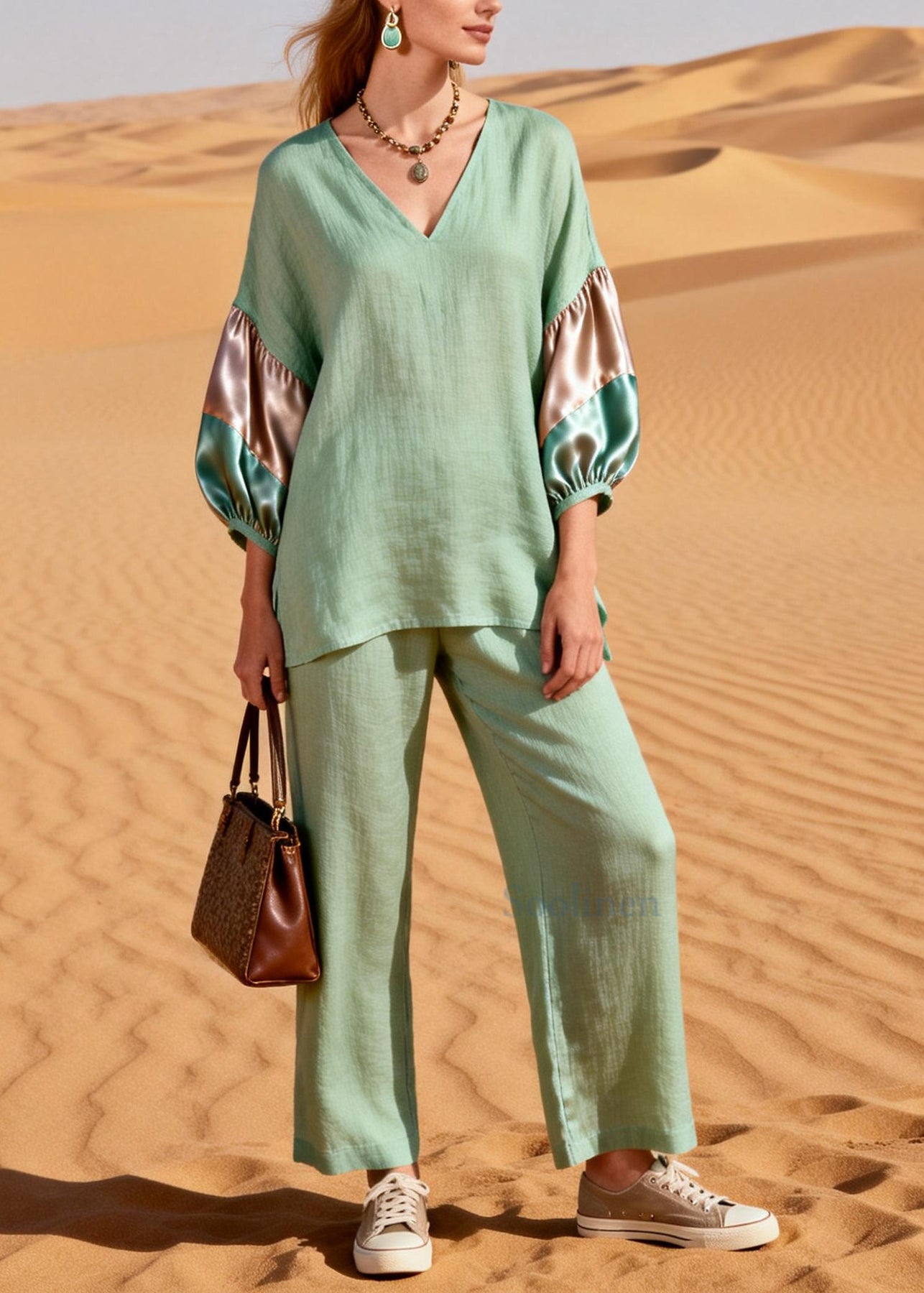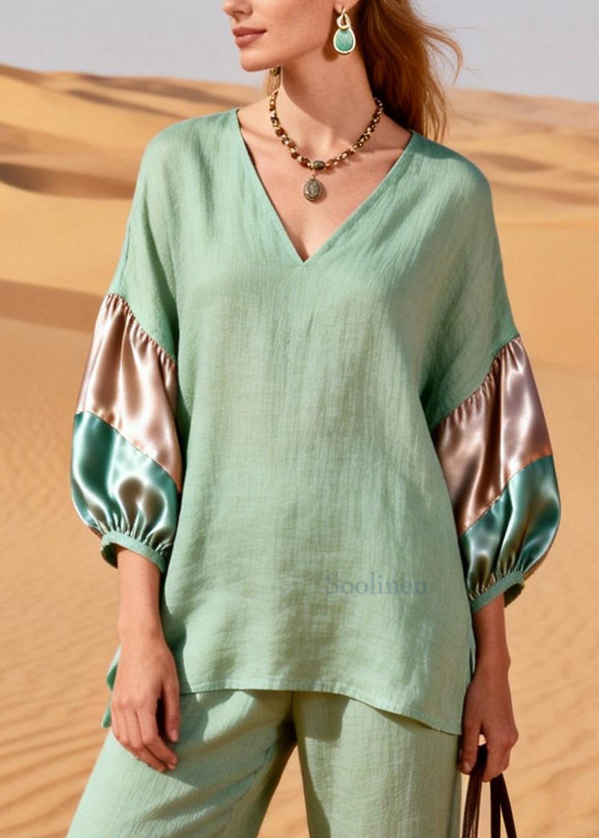 Italian Light Green V Neck Patchwork Cotton Two Pieces Set Summer