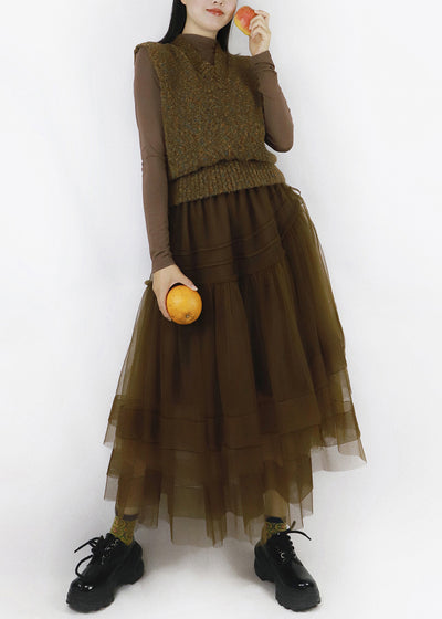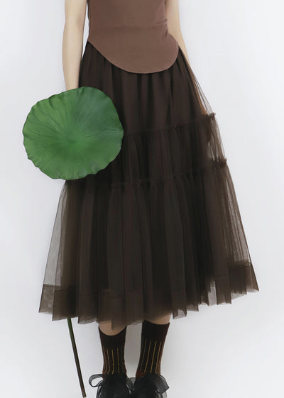 Chocolate Solid Patchwork Tulle Pleated Skirt Elastic Waist