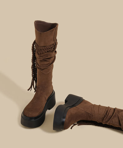 Brown Suede Tassel Wrinkled Splicing Boho Boots