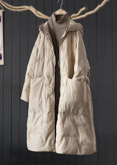 Plus Size Coffee Hooded Zippered Pockets Duck Down Coat Long Sleeve