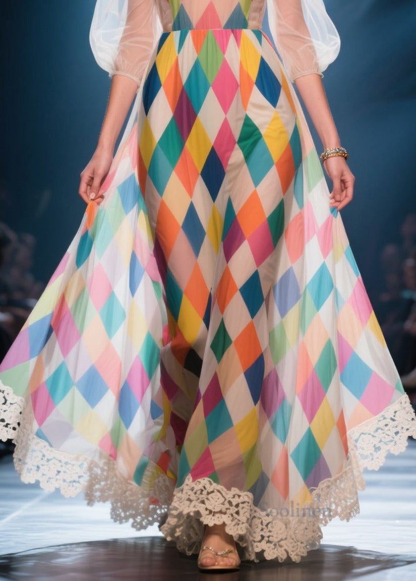 Multicolour Plaid Chiffon Party Dress Cold Shoulder Puff Sleeve
