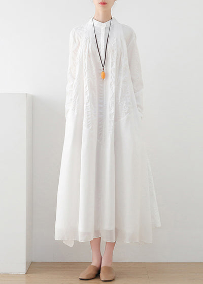 White Chiffon Patchwork Cotton Vacation Dresses Button Long Sleeve