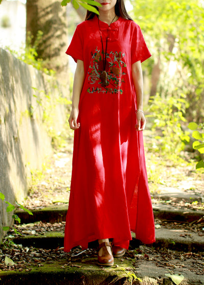 Women Red Mandarin Collar side open Embroideried Long Dress Short Sleeve