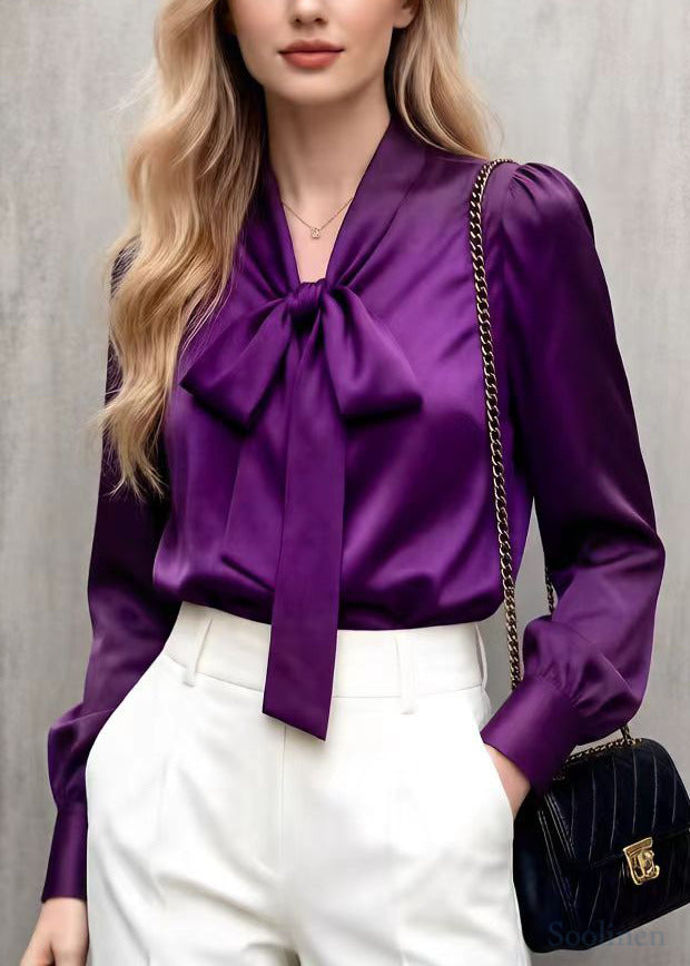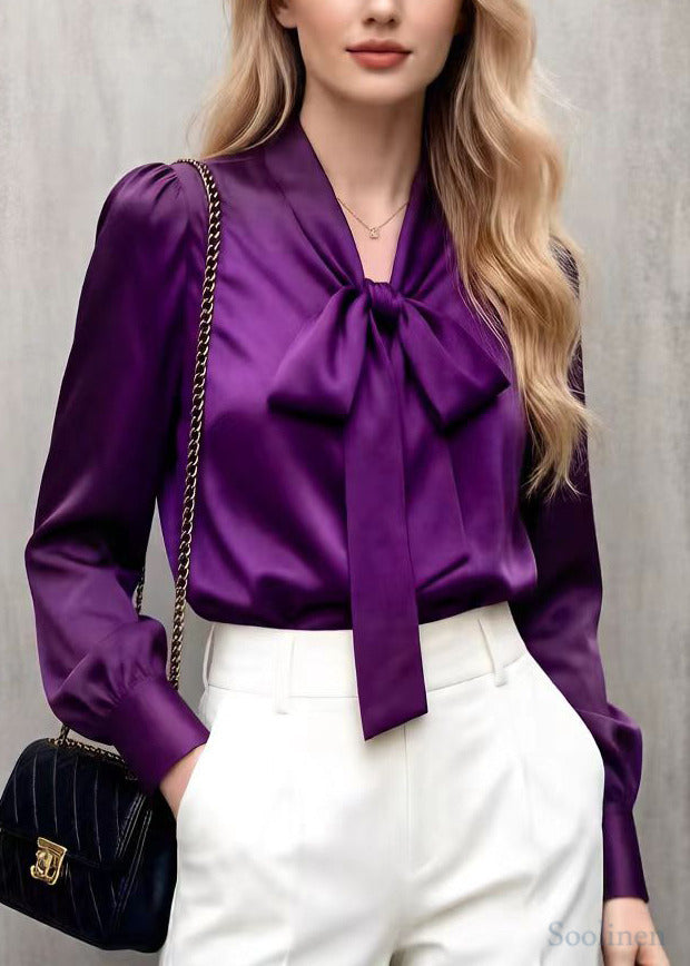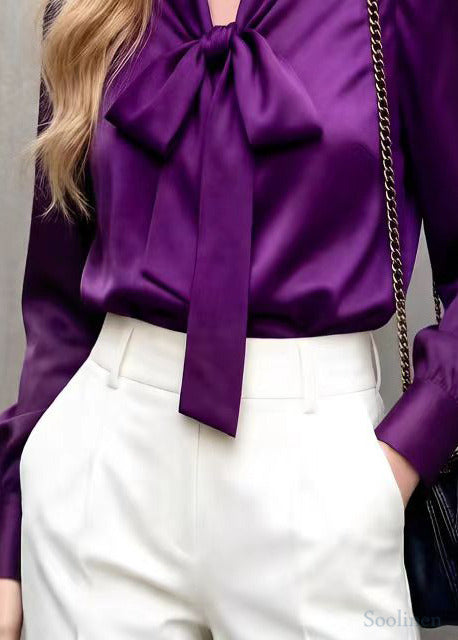 Boho Purple Bow Collar Draping Chiffon Blouses Spring