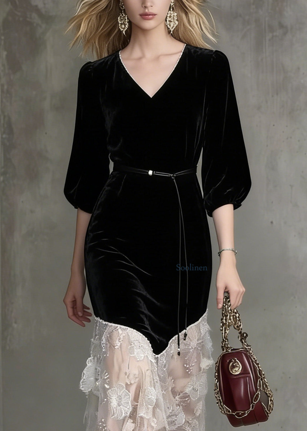 Stylish Black O Neck Embroidered Patchwork Velvet Dress Spring