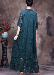 Women Green Button Embroideried Side Open Lace Long Dress Half Sleeve