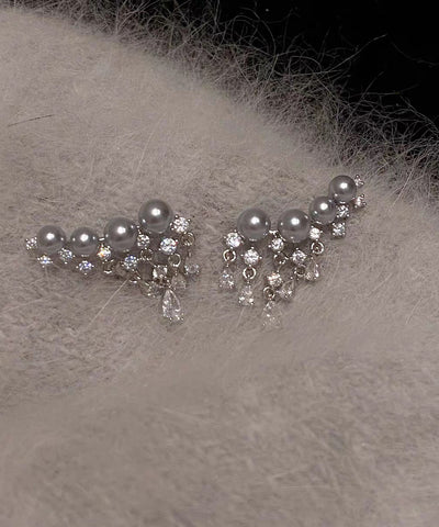 Classy Grey Copper Overgild Zircon Pearl Tassel Stud Earrings