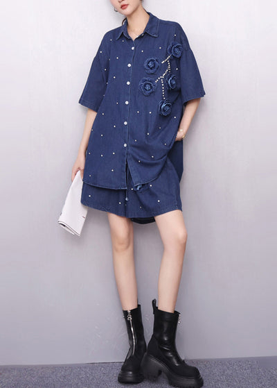 Handsome Navy Embroidered Floral Nail Bead Two Piece Set Summer