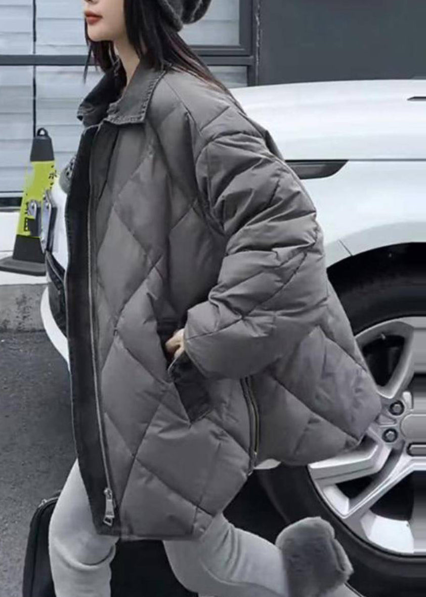 Boutique Grey Peter Pan Collar Pockets Plaid Zippered Puffers Jackets Winter