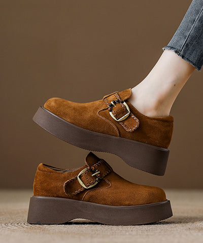 Caramel Suede Platform Flat Shoes For Women Splicing Buckle Strap