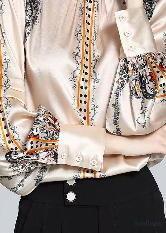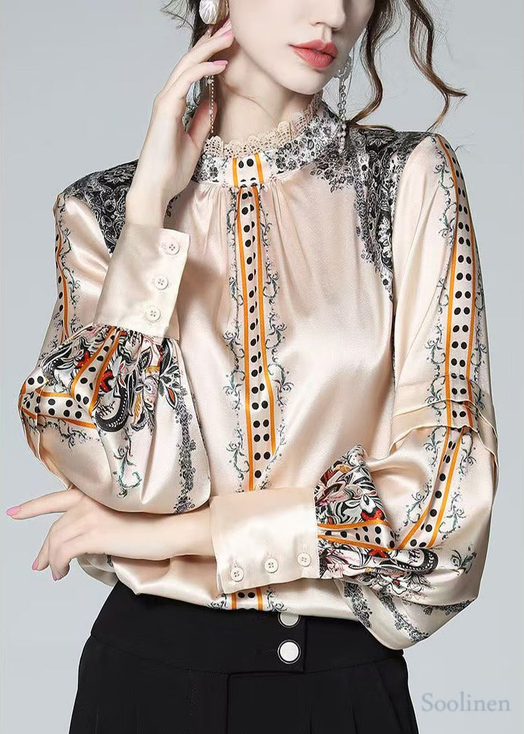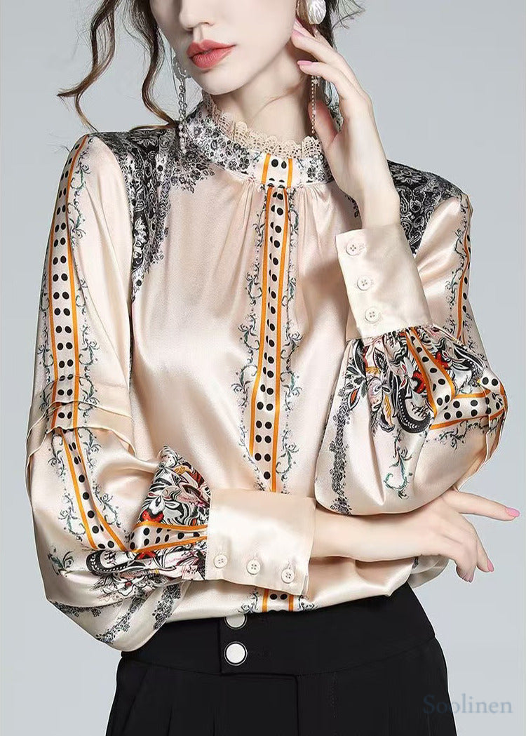 Elegant Champagne Stand Collar Print Silk Shirt Top Spring