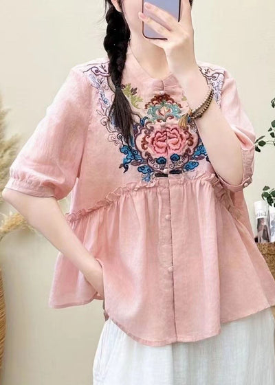 Loose Pink Embroidered Ruffled Linen Shirt Summer
