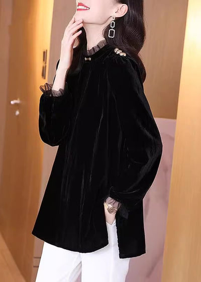 Modern Black Peter Pan Collar Patchwork Solid Shirt Lantern Sleeve