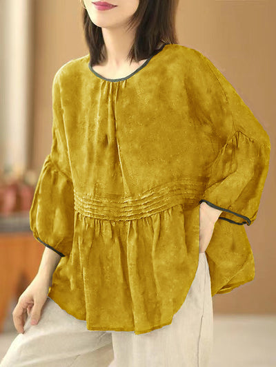 Handmade light yellow O Neck Print Wrinkled Patchwork Cotton Top Summer