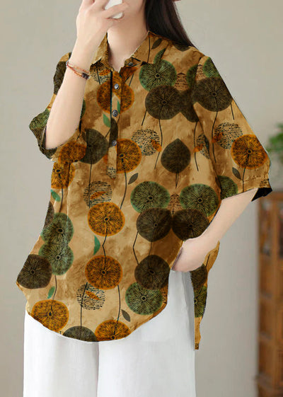Italian Yellow-dandelion Peter Pan Collar Print Patchwork Cotton Blouses Summer
