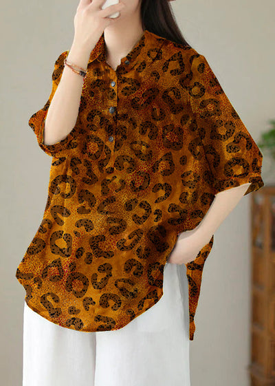 Italian Yellow-leopard print Peter Pan Collar Print Patchwork Cotton Blouses Summer