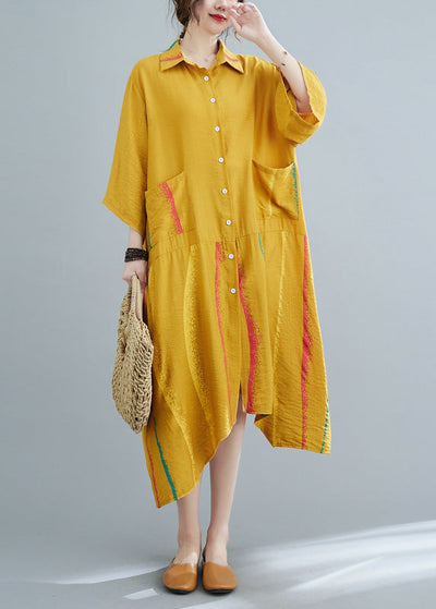 Vintage Yellow O Neck Chinese Button Patchwork Cotton Dresses Summer