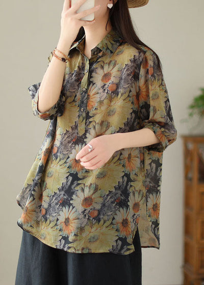Chinese Style Yellow Print Chinese Button Silk Shirt Tops Summer