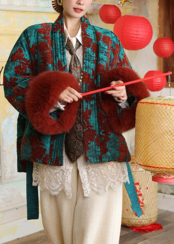 Chinese Style Peacock Blue V Neck Patchwork Tie Waist Fine Cotton Filled Parka Winter