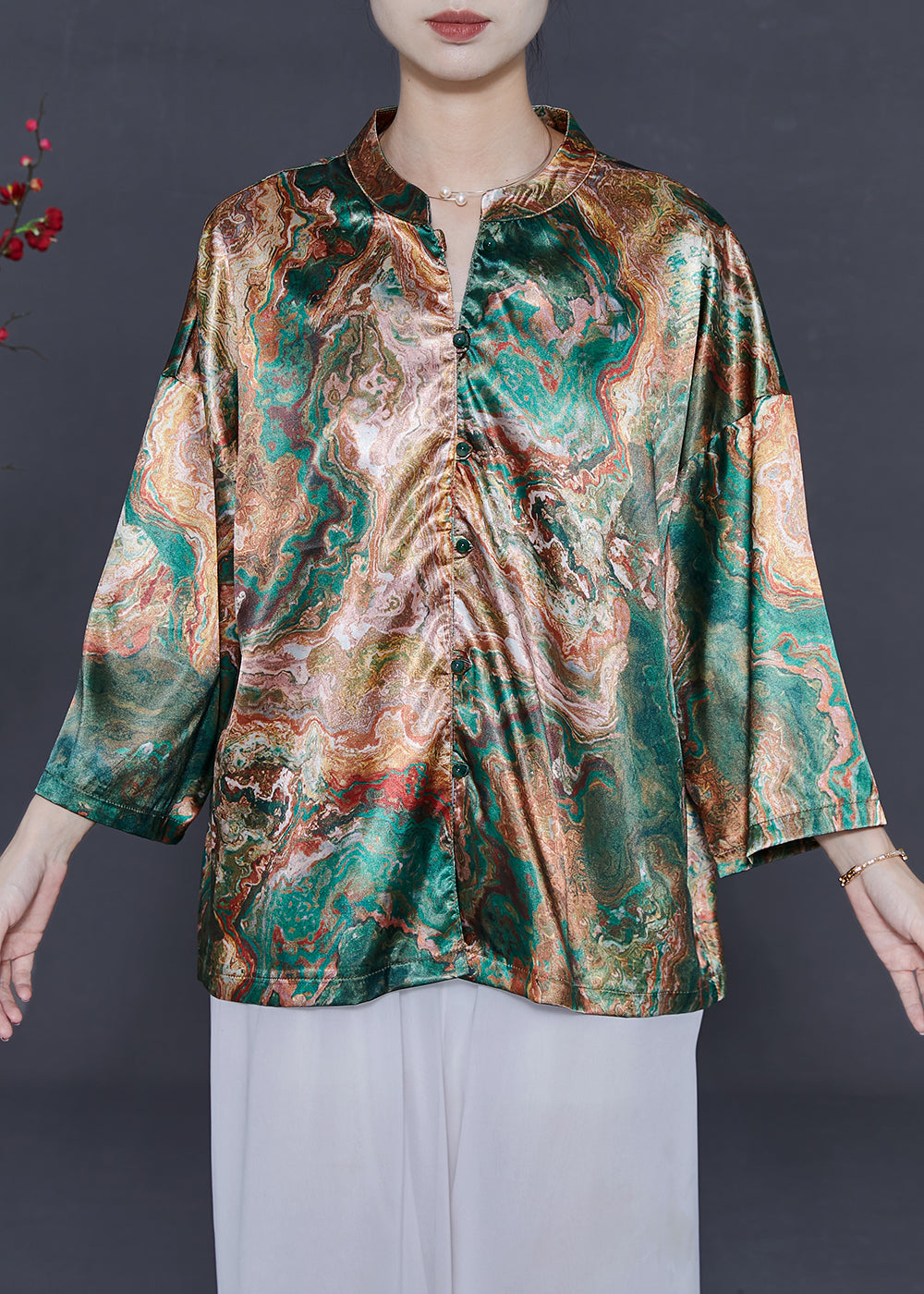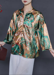 Elegant Stand Collar Print Silk Shirt Bracelet Sleeve