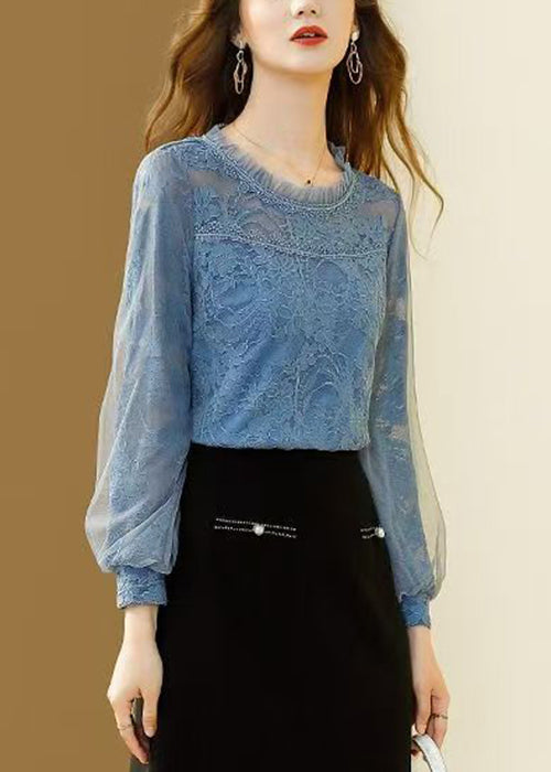 Slim Fit Blue Ruffled Button Lace Shirt Spring