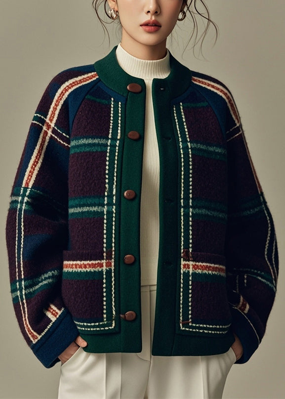 Chic Green Plaid Button Patchwork Woolen Coats Winter