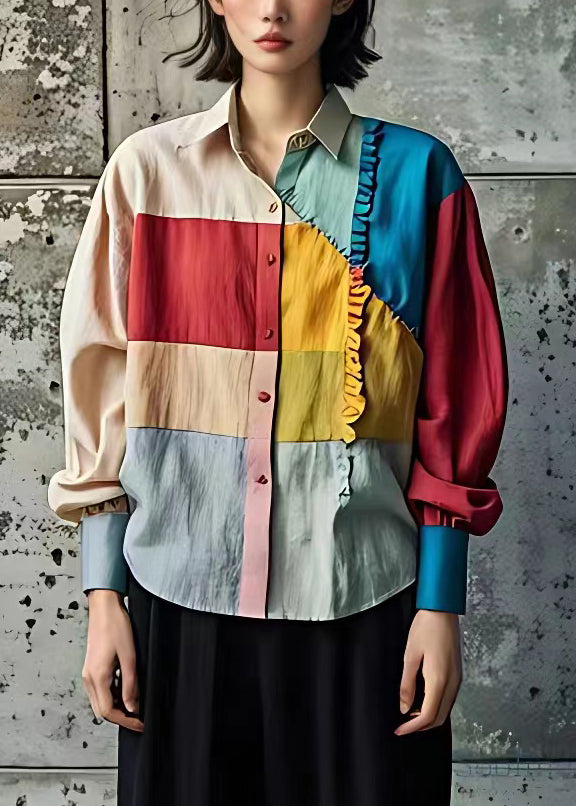 Bohemian Rainbow Ruffled Patchwork Button Tops Long Sleeve