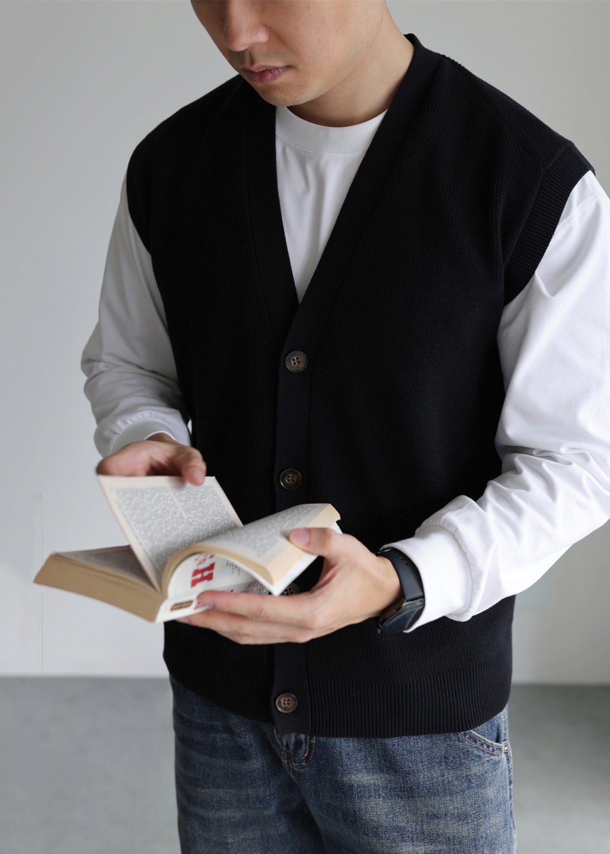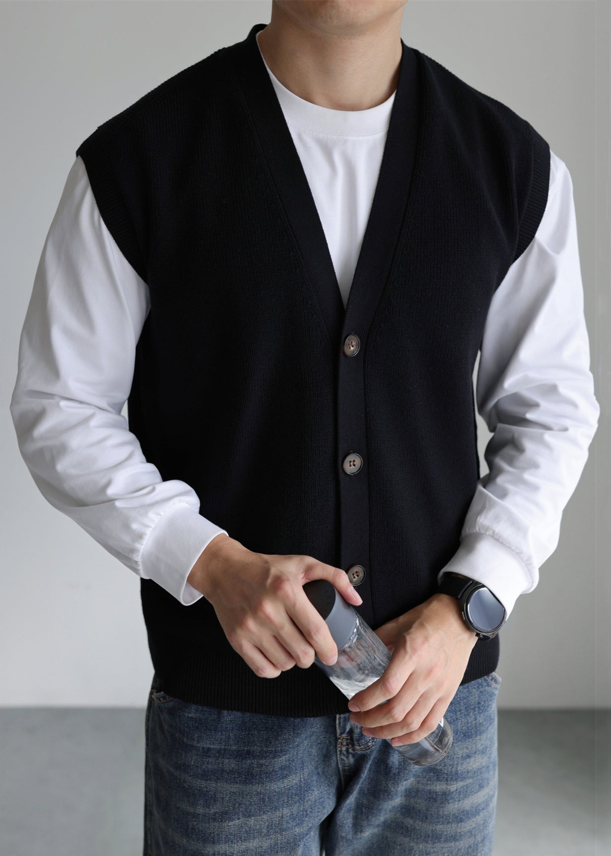 Loose Navy V Neck Button Knit Vest Men Sleeveless