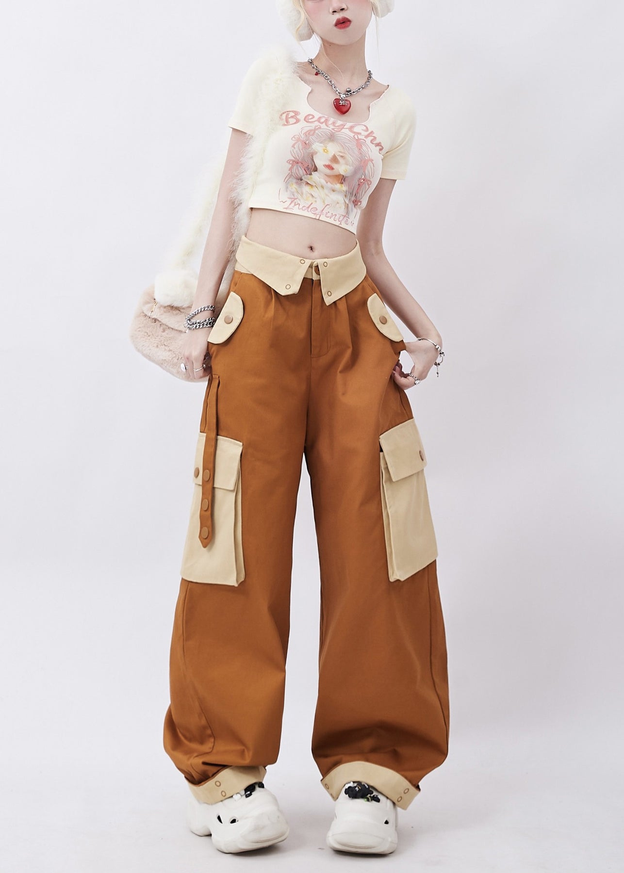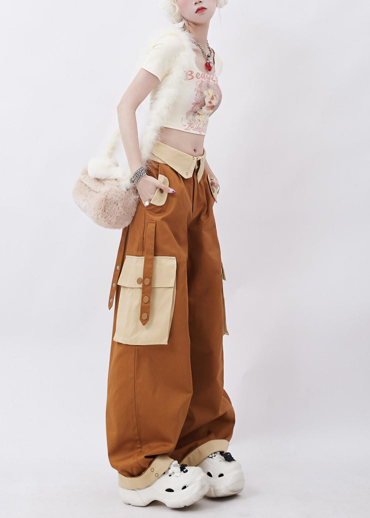 Casual Brown Patchwork Pockets Cotton Pants Trousers Spring