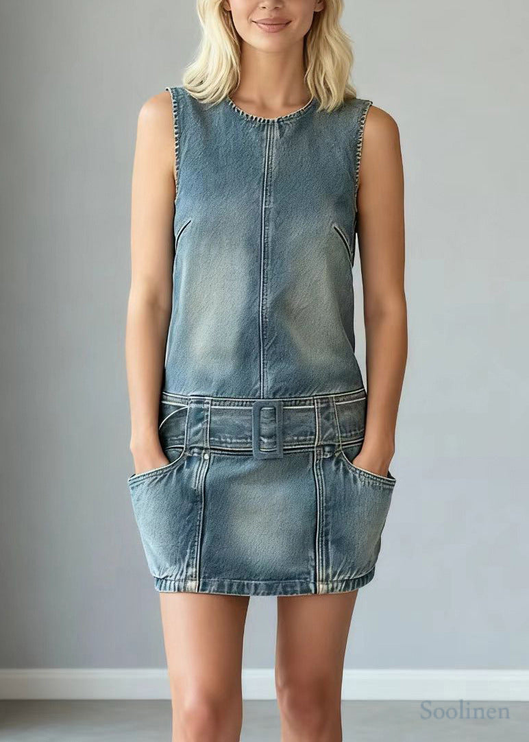 Modern Blue Tie Waist Denim Day Mini Dress Sleeveless