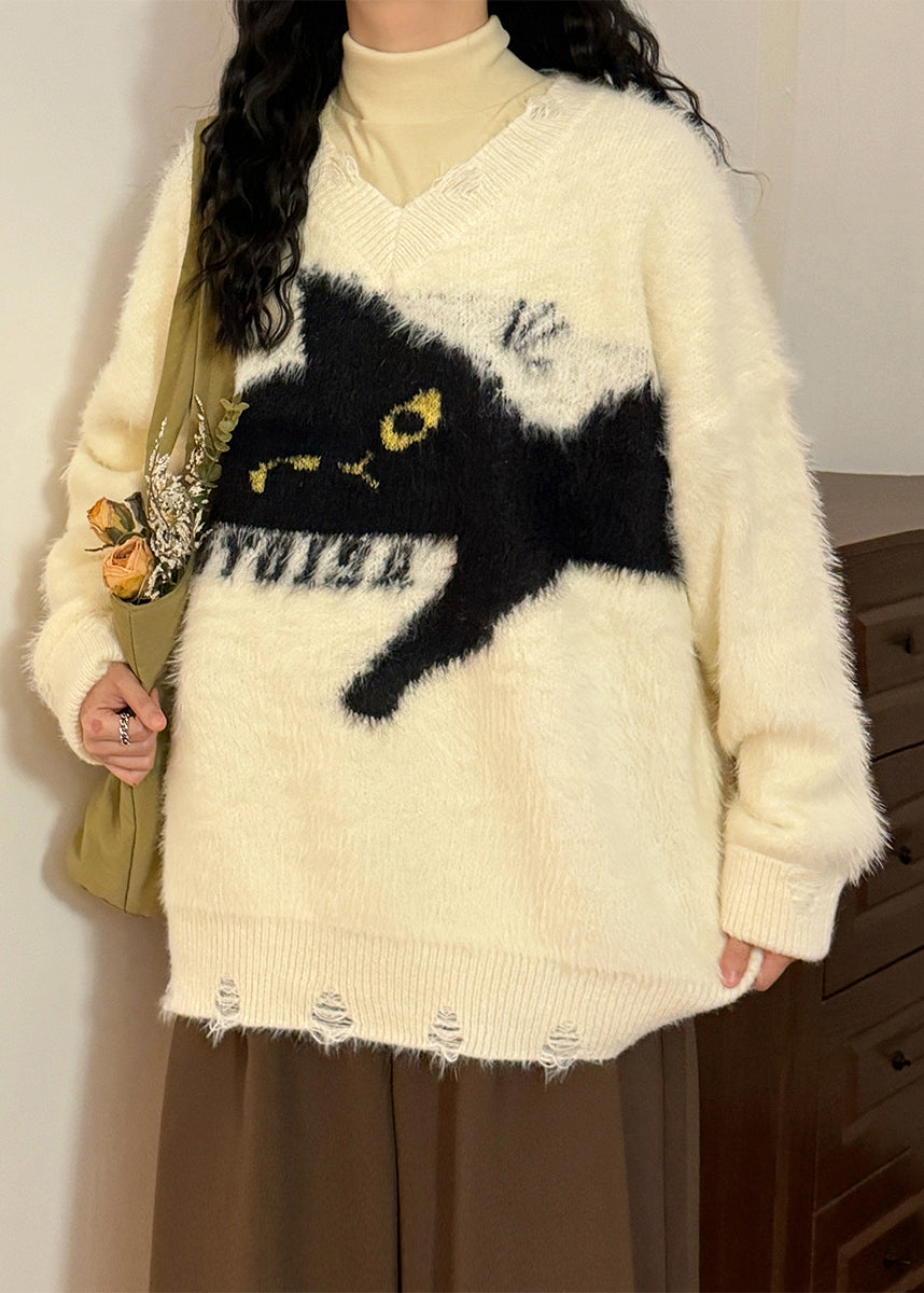 Loose Beige Hole Cats Cozy Mink Hair Knitted Sweater Spring
