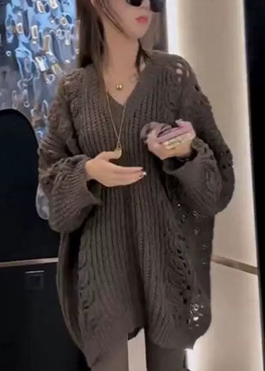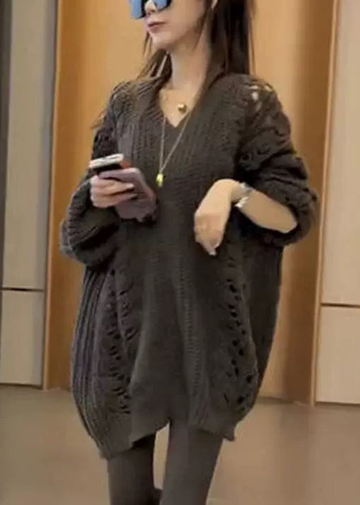 Loose Dark Gray V Neck Hollow Out Knit Sweater Spring