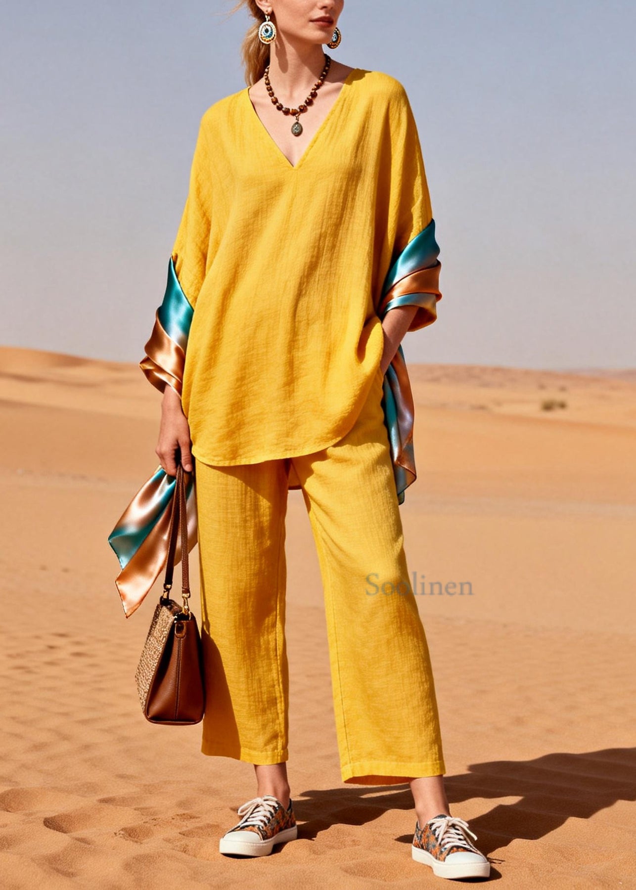 Bohemian Yellow Oversized Patchwork Shawl Cotton Two Piece Set Women Clothing Spring