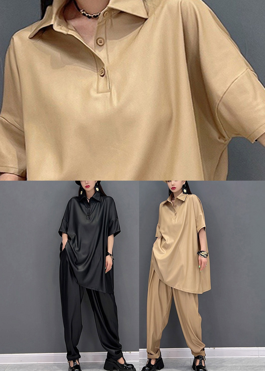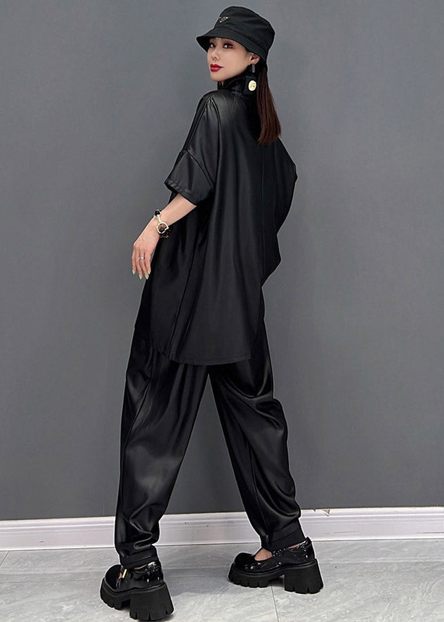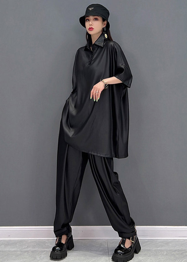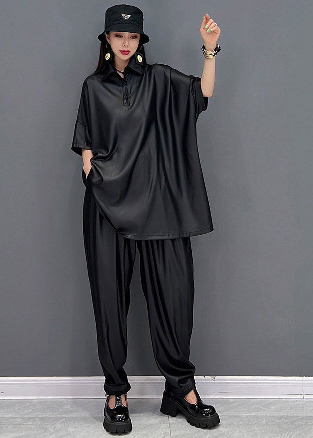 Black Peter Pan Collar T Shirt And Beam Pants Two Pieces Set Summer