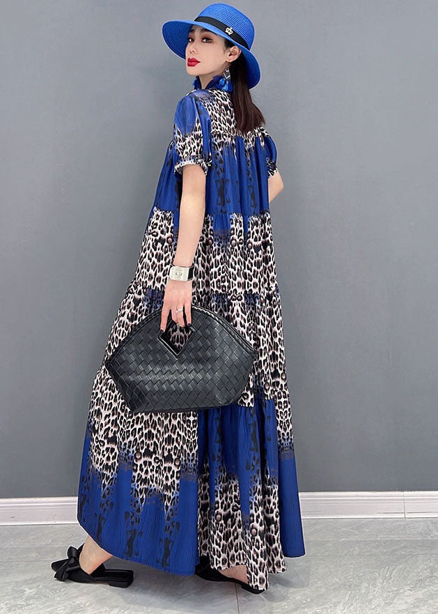 Bohemian Stand Collar Leopard Print Wrinkled Long Dress Short Sleeve