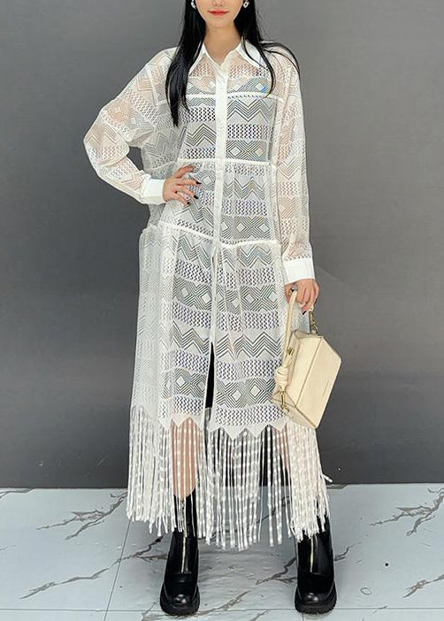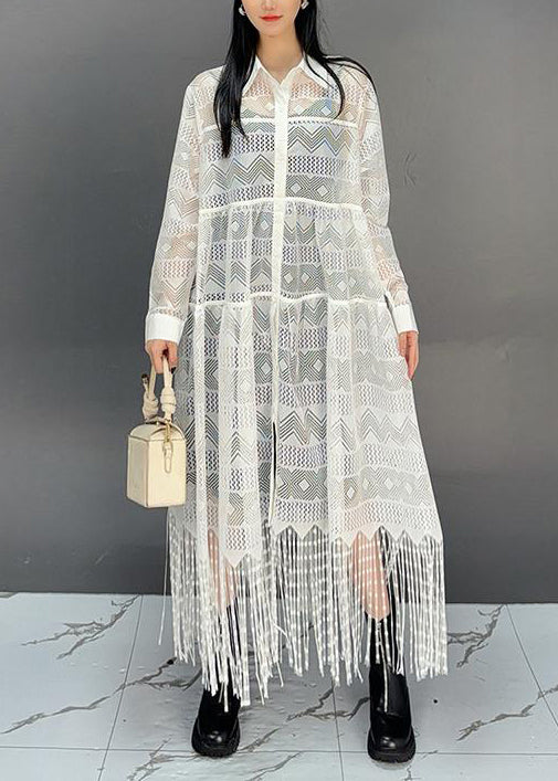 Italian Black Peter Pan Collar Tassel Hollow Out Cotton Shirts Dress Fall