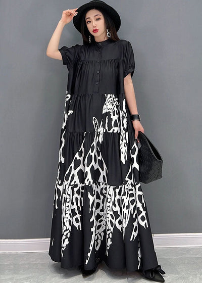 Bohemian Stand Collar Leopard Print Wrinkled Long Dress Short Sleeve