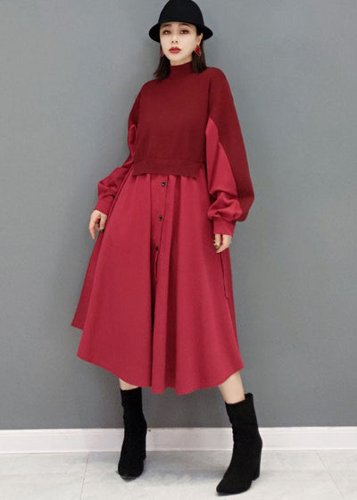 Red Patchwork Knit Cotton Long Dresses Solid Color Button Long Sleeve