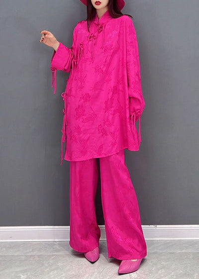 Rose Jacquard Silk Long Tops And Wide Leg Pants Two Pieces Set Stand Collar Long Sleeve