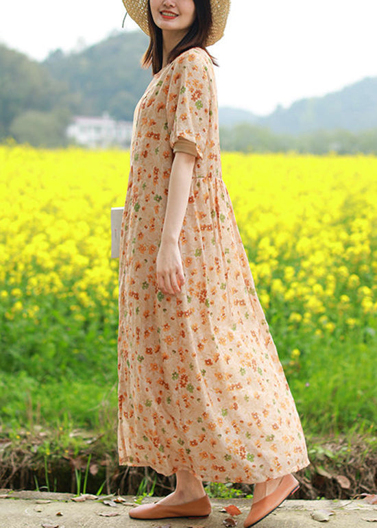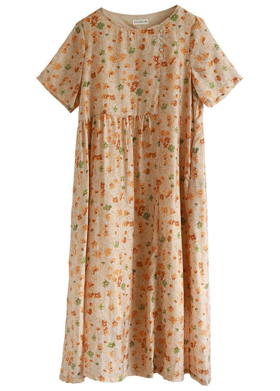 Niedliche O-Neck Cinched Button Print Lange Kleider Kurzarm