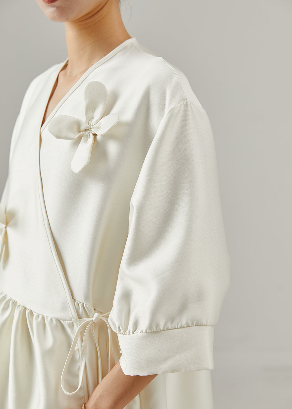 Boutique White Three-dimensional Floral Lace Up Silk Dress Summer