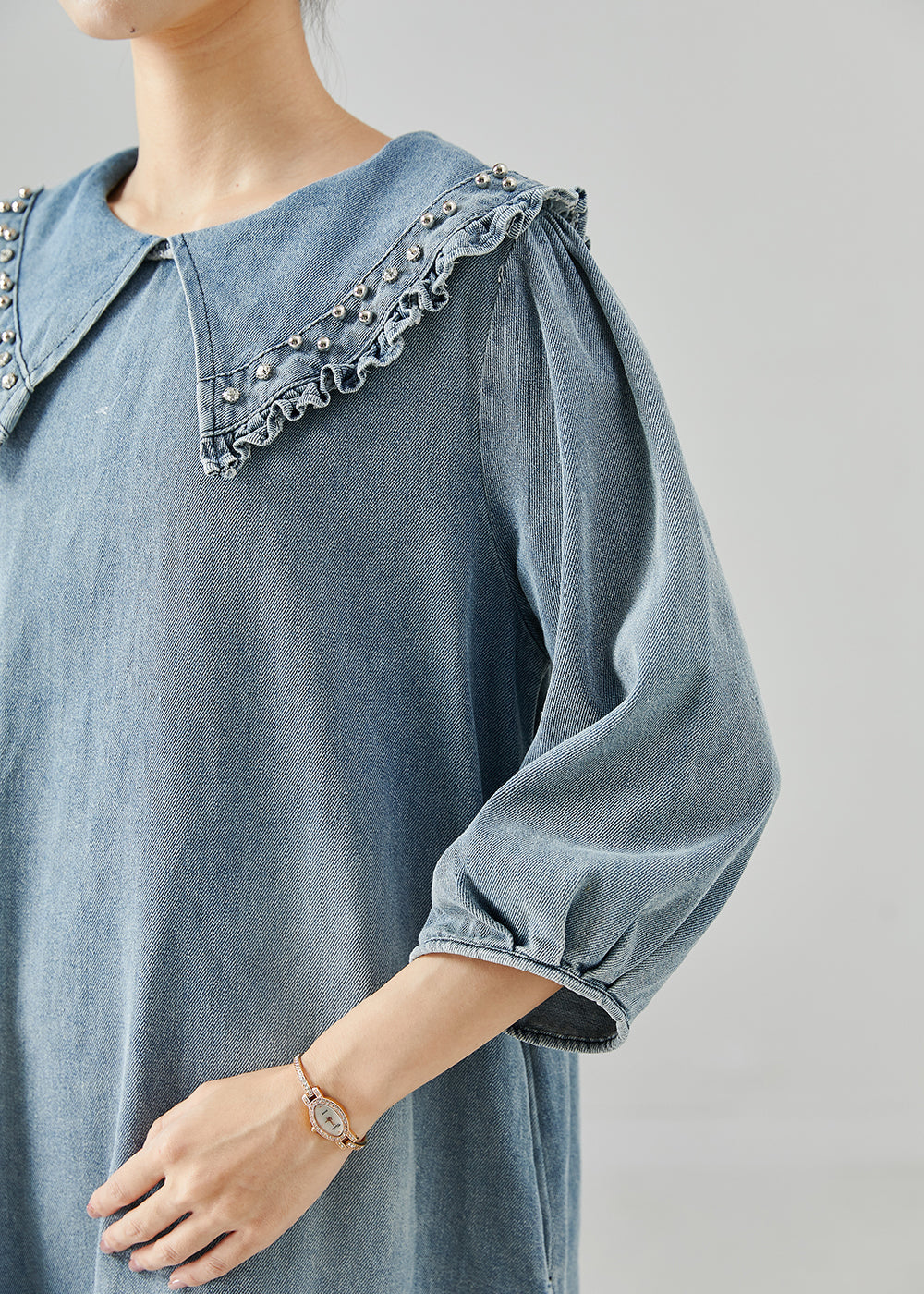 Casual Blue Peter Pan Collar Rivet Denim Day Dress Bracelet Sleeve