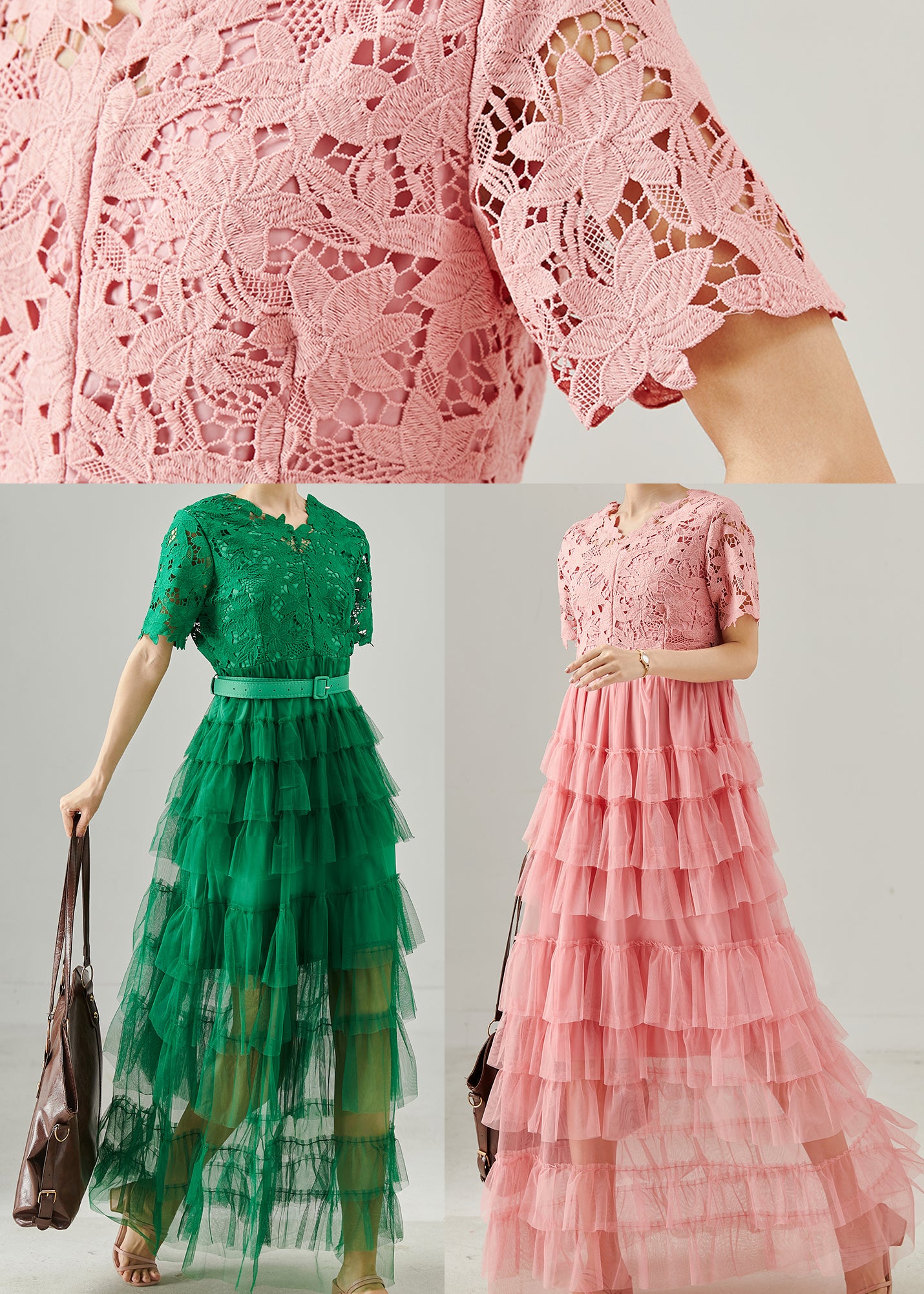 Pink Patchwork Tulle Maxi Dresses Square Collar Ruffled Summer