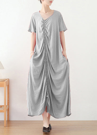 Hellgrau gestreifte lange Kleider aus Baumwolle mit kurzen Ärmeln