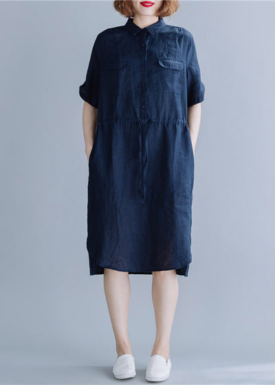 Lange Kleider aus blauem, zerknittertem Leinen in Übergröße mit halben Ärmeln