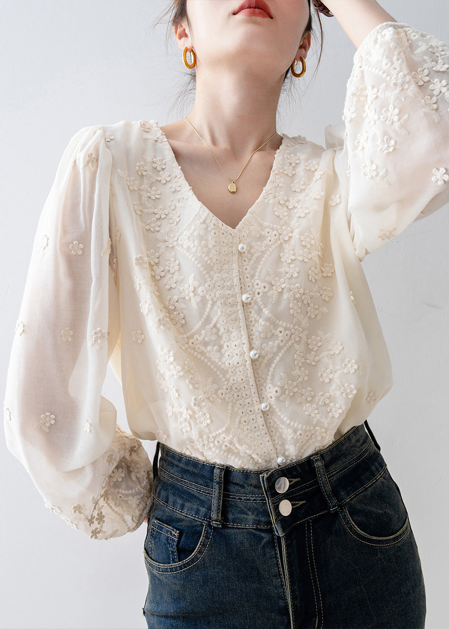 Organic Beige Embroidered Nail Bead Chiffon Shirt Tops Spring