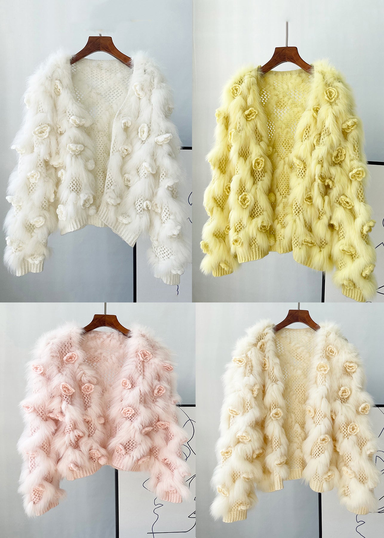 Beautiful Apricot Floral Mink Hair Knitted Coats Lantern Sleeve