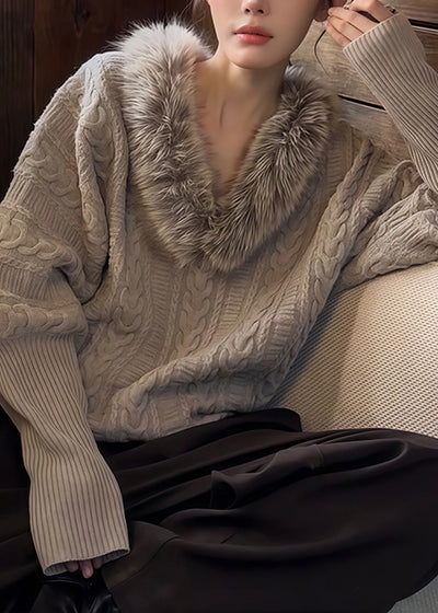 Handmade Light Grey Fur Collar Grey Cotton Knit Sweaters Batwing Sleeve